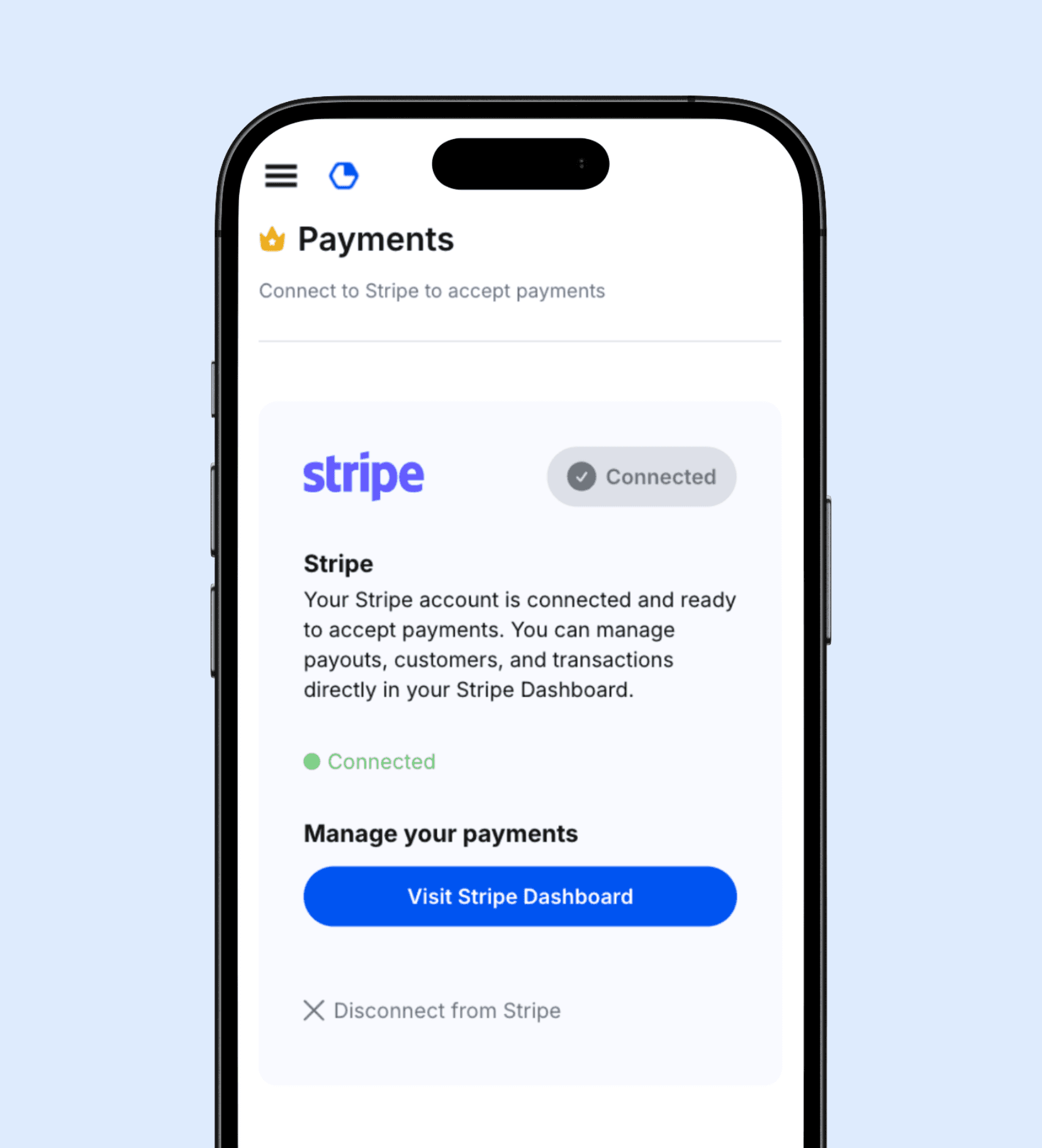 With the Pro Plan, you can connect your Stripe account and accept payments right through your booking page. If you don’t have a Stripe account yet, you can create one for free during setup. You can also choose to charge your clients in person or handle payments however you prefer.