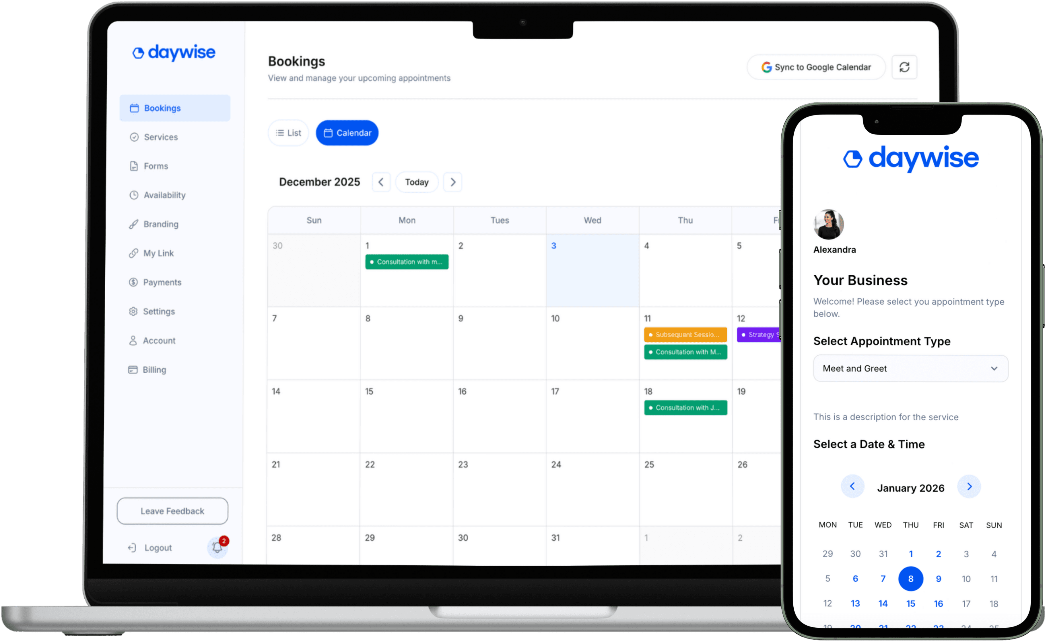 Daywise helps solo businesses book clients and stay organized in a stunning, easy-to-use app.