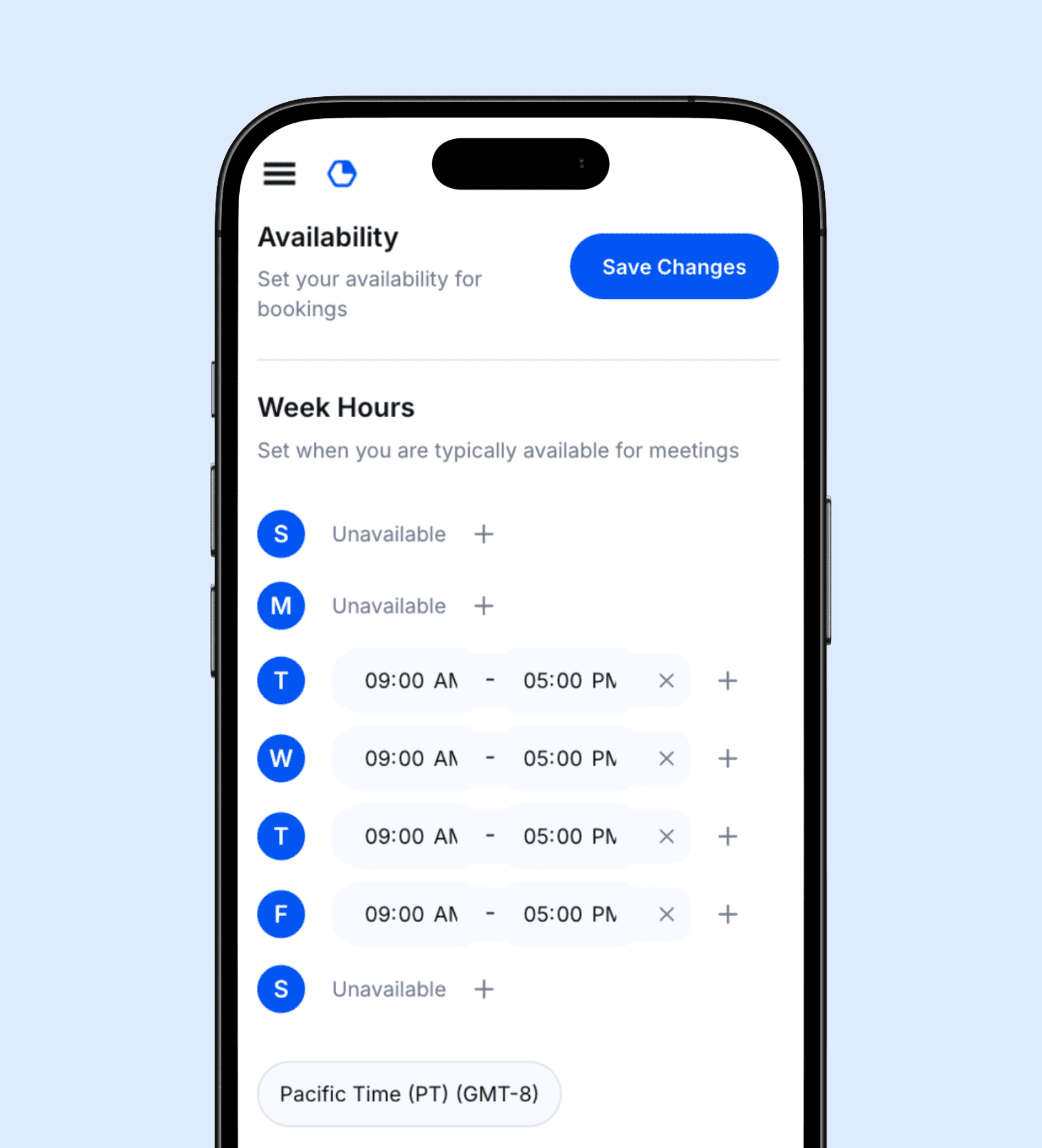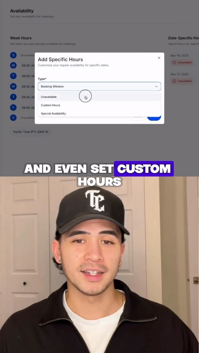 You have full control of your schedule. You can block off months, weeks, or individual days, set custom hours, and override specific dates whenever you need.